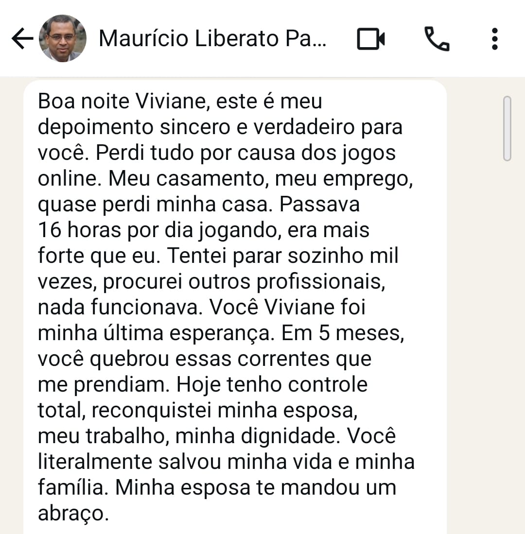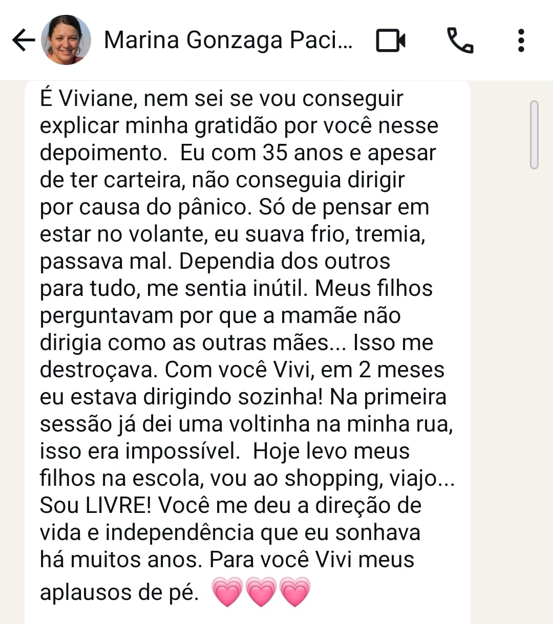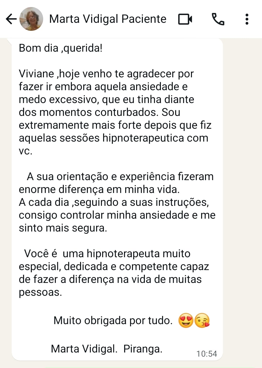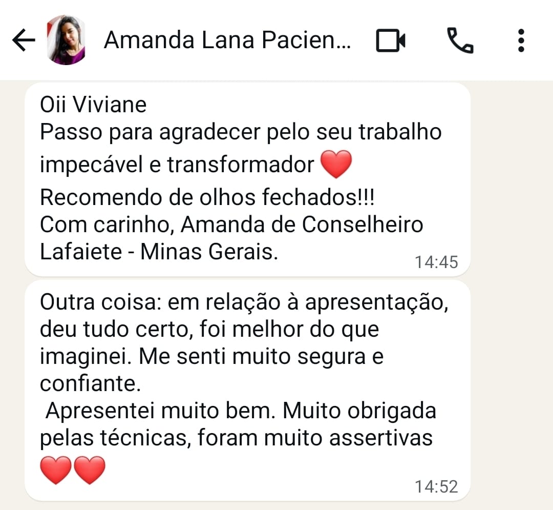 "É um tratamento que me ajudou muito na questão da ansiedade que eu tinha, melhorar minha autoconfiança e na questão de foco nos estudos e também a superar alguns traumas!"