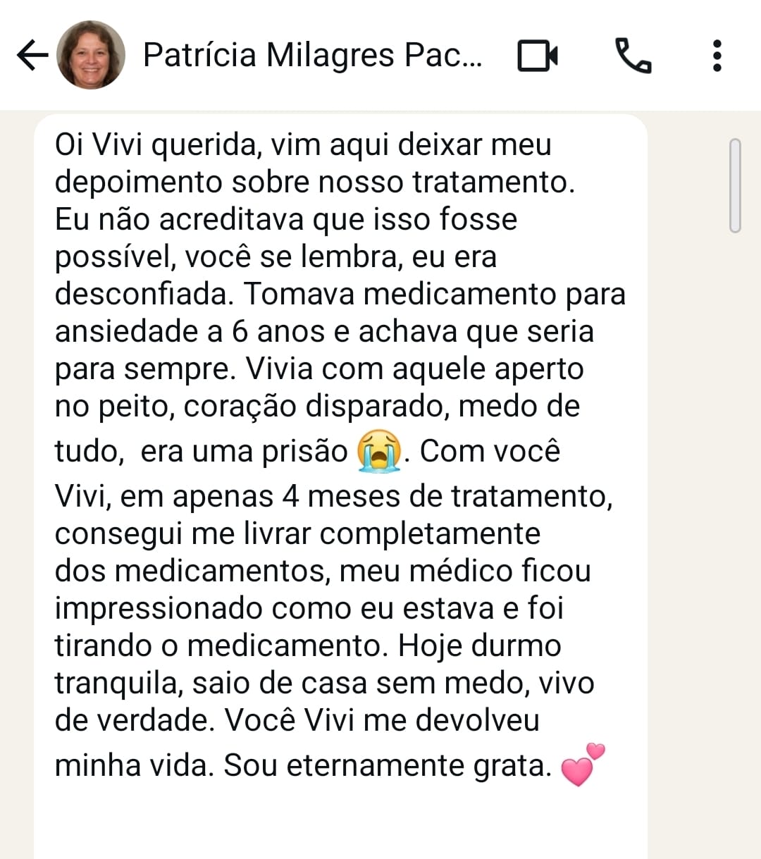 "Eu tomava remédio para ansiedade todos os dias durante 3 anos e em menos de 3 meses de tratamento eu consegui me livrar dele. Hoje em dia não dependo mais do remédio para controlar a ansiedade, eu nem sinto ansiedade mais!"